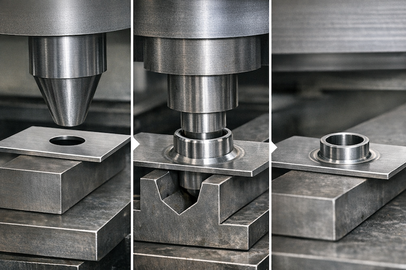 バーリングは、下穴を押し広げて筒状に立ち上げる加工です。板金で「ねじかかり代」を作るためによく使われます。