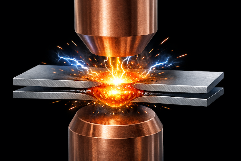 スポット溶接は、電極で板を挟み、電流を流して局所的に溶接する抵抗溶接です。薄板同士の接合に非常に向いています。
