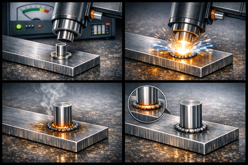 スタッド溶接は、ボルトやスタッドを板金に直接溶接する加工です。裏側からナットを締められない場合に非常に有効です。