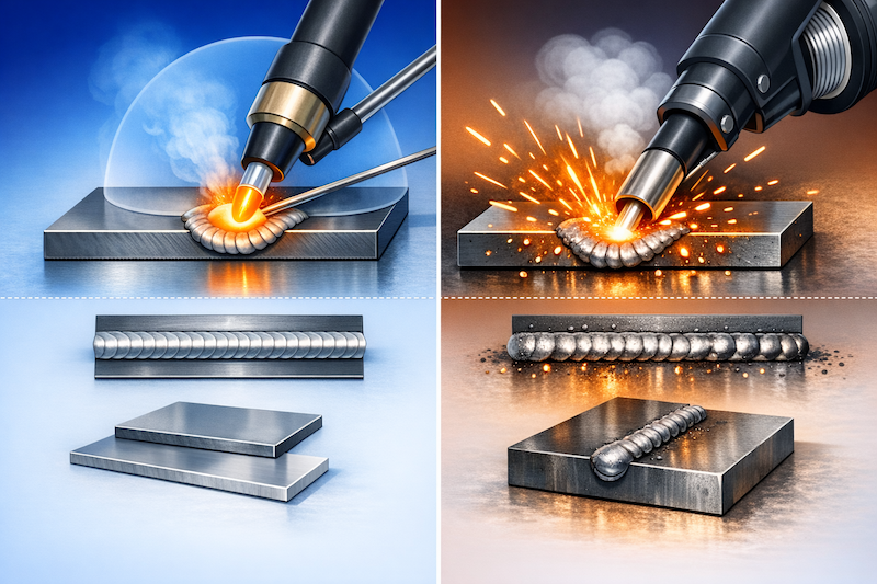TIG溶接は、タングステン電極と不活性ガスでシールドする溶接方法で、MAG溶接は、溶接ワイヤそのものが電極(自動送給)で活性ガス(CO₂ または Ar+CO₂)を使用するので半自動溶接ができる溶接方法です。外観は悪くなりやすいですがその分速度が早いという違いがあります。