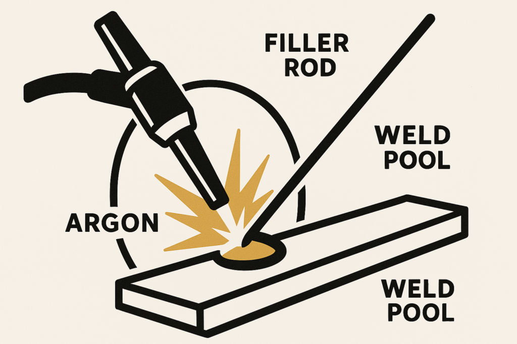 タングステン電極と不活性ガス(主にアルゴン)でアークを発生させ、溶加棒を使って溶接する方法です。 入熱量が細かくコントロールできるため、薄板・精密部品・SUS304・アルミへの適用に優れています。 仕上がりが美しく、産業設備では多用される工法です。その分、熟練技術が必要で、溶接速度はMIGより遅い傾向があります。