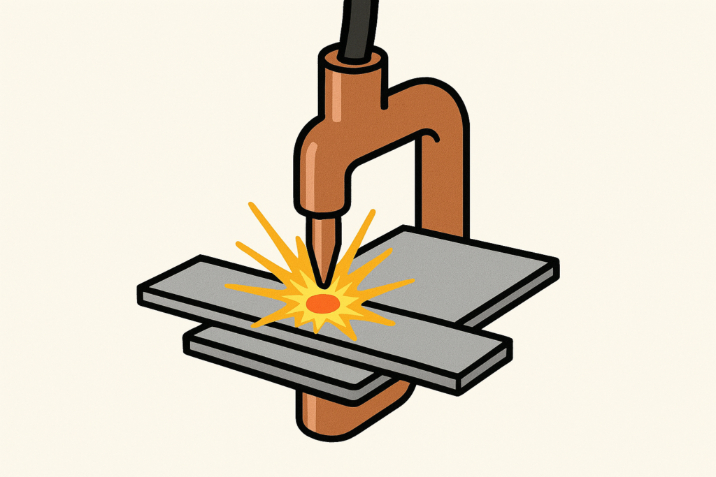 電極で板を挟み、電流を流して点状に溶接する方法です。 t1.0〜2.0の重ね継手に多用され、板金カバーや筐体に適します。 溶接跡(ナゲット)が点状になるため、引張方向には強いが剥離方向には弱い特性があります。 産業設備の外装カバーや電装ボックスに多く使われます。