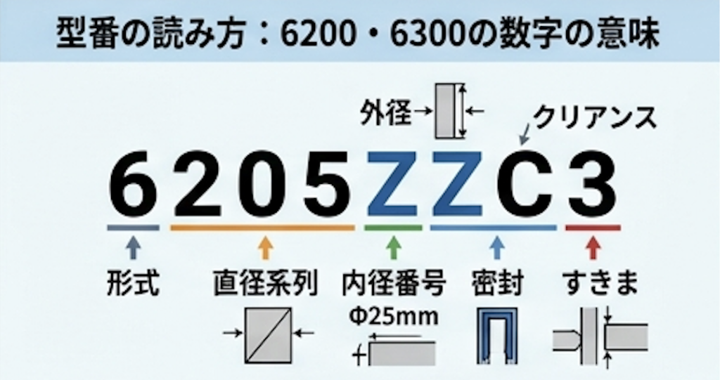 深溝玉軸受の型番はJIS B 1513で規定されており、記号の意味を知ればカタログが読めます。