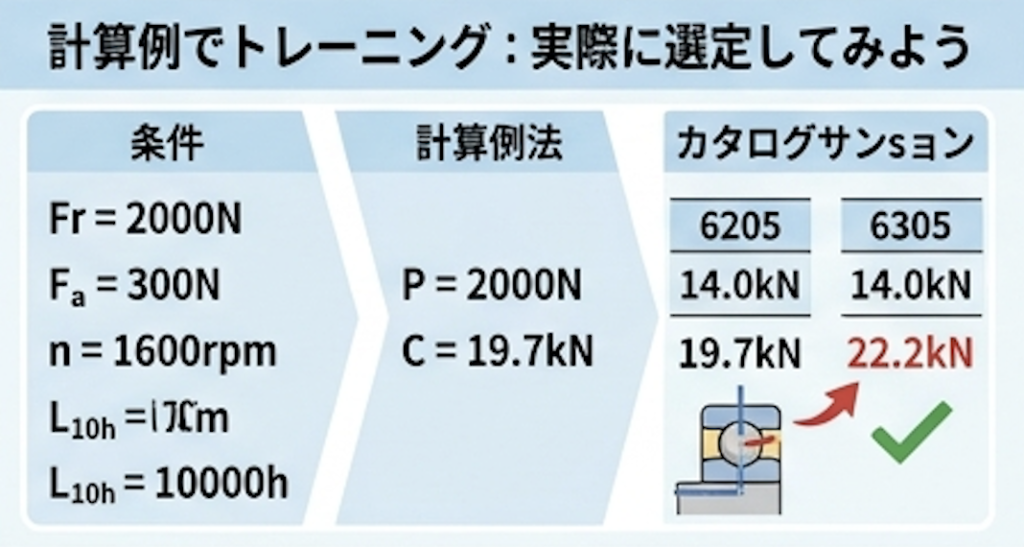 JTEKTカタログ参照:6205 の Cr = 14.0 kN(不足)→ 6305 の Cr = 22.2 kN ✔