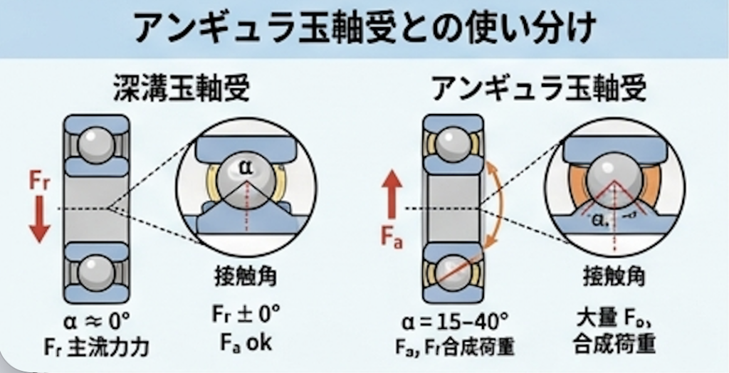 選び方の目安:アキシアル荷重がラジアル荷重の30%以下なら深溝玉軸受で問題なし。工作機械主軸のような「高精度+高剛性+大きいアキシアル荷重」が必要な場合にアンギュラ玉軸受を使います。