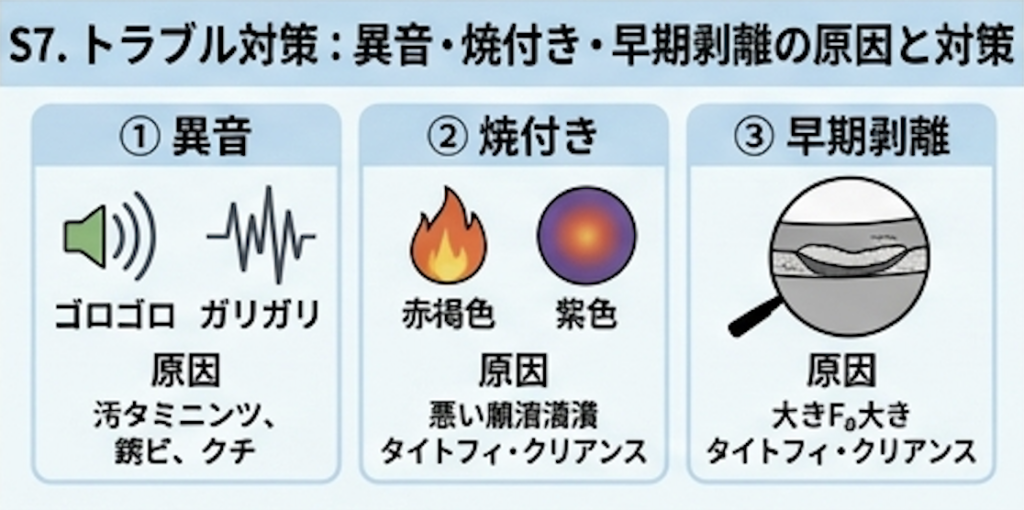 トラブル対策:異音・焼付き・早期剥離の原因と対策